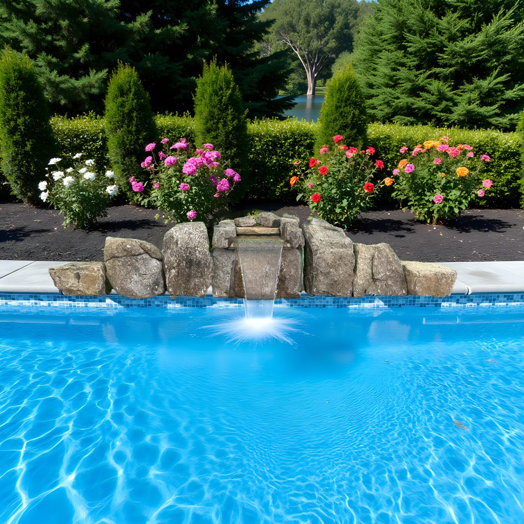 1.5′ high x 8′ wide natural stone Genesis Waterfall Kit featuring a single 12″ wide waterfall.
