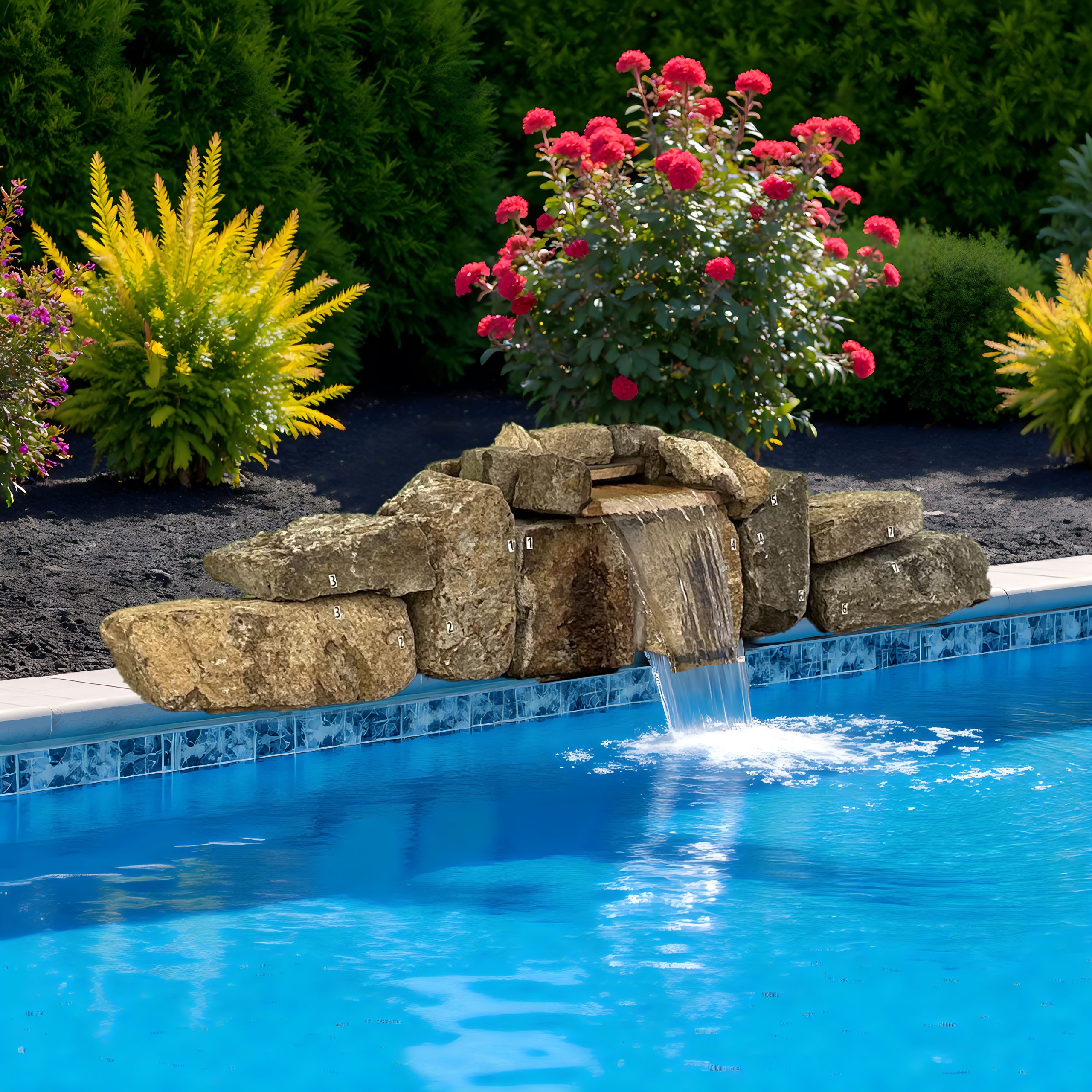 1.5′ high x 8′ wide natural stone Genesis Waterfall Kit featuring a single 12″ wide waterfall.